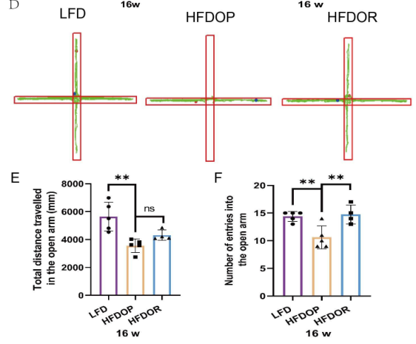 為了排除抑郁和焦慮樣行為對(duì)肥胖抵抗的影響,在16周結(jié)束時(shí)進(jìn)行了自發(fā)開場(chǎng)活動(dòng)實(shí)驗(yàn)和高架十字迷宮實(shí)驗(yàn)。開場(chǎng)實(shí)驗(yàn)結(jié)果如圖2A-C所示。HFDOP組進(jìn)入中心區(qū)域的次數(shù)和進(jìn)入該區(qū)域的次數(shù)顯著低于LFD組(圖2B、C)。HFDOR 組比 HFDOP 組更遠(yuǎn)地進(jìn)入中心區(qū)域并且更頻繁地進(jìn)入該區(qū)域(圖2B、C)。高架十字迷宮實(shí)驗(yàn)表明,與LFD組相比,HFDOP組進(jìn)入開臂的次數(shù)和頻率都要少得多(圖3E、F)。HFDOR組比HFDOP組開臂走得更遠(yuǎn),但兩組之間沒有統(tǒng)計(jì)學(xué)意義。HFDOR組比HFDOP組更頻繁地進(jìn)入開臂(圖3F)。
