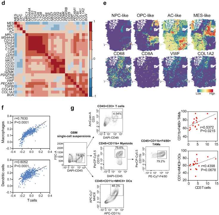 利用反卷積算法對TCGA數(shù)據(jù)進一步進行分析,發(fā)現(xiàn)T細胞豐度與巨噬細胞、樹突狀細胞顯著相關,這是兩個主要的髓系細胞(圖3f);利用流式細胞術,分析小鼠GBM中的免疫細胞,證實了T細胞與CD11b + F480 +腫瘤相關巨噬細胞(TAM)或CD11c + MHCII + DC顯著正相關(圖3g)。因此,間充質(zhì)亞型中T細胞比例較高主要是由于巨噬細胞的浸潤。