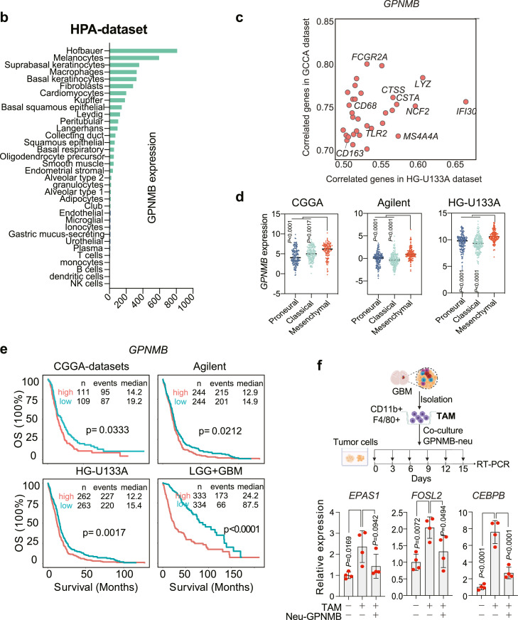 HPA和TCGA數(shù)據(jù)分析結(jié)果顯示,GPNMB主要在巨噬細胞中表達,并且與巨噬細胞標志物顯著正相關,這表明巨噬細胞是GPNMB的主要來源(圖4b, c),流式細胞術結(jié)果證實了GPNMB主要在巨噬細胞上表達,而不是樹突狀或腫瘤細胞。Tips:流式細胞術是單細胞測序常見的下游驗證方法,可用來分選目標細胞類群、驗證細胞比例的變化和新鑒定的maker基因作為特定細胞分選的可行性等。