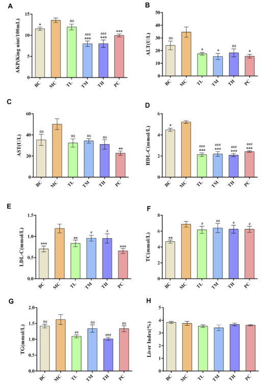 TM組和TH組降低AKP效果優(yōu)于TL組,TG組降低AKP效果優(yōu)于TM組。PC組降低AKP的效果優(yōu)于TL組,但差于TM組和TH組。PC組降低低密度脂蛋白膽固醇的效果優(yōu)于TM組和TH組,表明高脂飼料可導(dǎo)致大鼠血脂和肝酶代謝異常,高脂高脂顆粒可改善高脂大鼠血脂代謝和肝酶活性。與陽性藥物相比,HRG在改善高密度脂蛋白膽固醇、甘油三酯、堿性磷酸酶方面具有優(yōu)勢,且改善程度可能呈劑量依賴性。各組間器官指數(shù)無顯著差異,HRG對小鼠生化指標(biāo)和器官指數(shù)的影響如圖2所示。