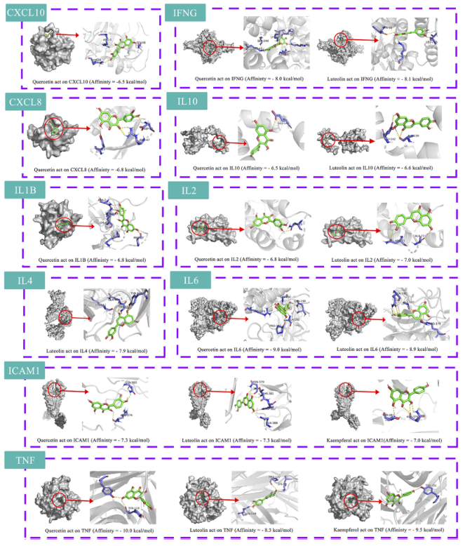 利用10個關(guān)鍵治療靶點、14個關(guān)鍵化合物和相關(guān)通路,通過Cytoscape構(gòu)建了“藥草-關(guān)鍵化合物-潛在靶點-通路”的網(wǎng)絡(luò)圖(圖4H)。排名前三的化合物被選為潛在化合物(槲皮素、木犀草素、山柰酚)。選擇前三個信號通路作為關(guān)鍵通路。繪制了 HRG 通過腸道菌群治療 NAFL 的通路機制(圖 4I)。將10個關(guān)鍵靶點與3個潛在化合物進(jìn)行分子對接,共獲得18對對接結(jié)果(表4),使用 Pymol 可視化結(jié)果(圖 5)。
