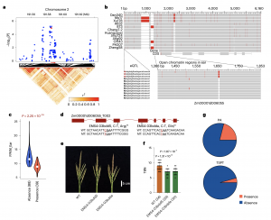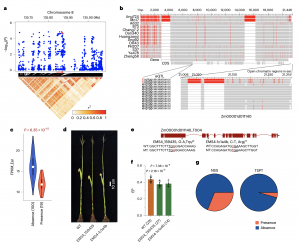 隨后,作者使用RNA-seq數(shù)據(jù)進(jìn)一步研究了不同pan-gene的表達(dá)譜。總體表達(dá)豐度情況從核心、軟核心到可變基因逐漸降低,表明核心基因具有穩(wěn)定和更廣泛的表達(dá)譜,而可變基因具有較低水平、組織特異性、品系特異性或條件依賴性表達(dá)。核心基因編碼區(qū)中非同義變與總突變的比率低于軟核心和可變基因(圖2f)??梢宰⑨尩幕虮壤龔暮诵?、軟核心到可變基因逐漸減少(圖2g)。以上結(jié)果表明,核心基因在進(jìn)化上更加保守。