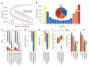 通過模擬分析發(fā)現(xiàn),總基因集隨著基因組的增加而增加,當(dāng)n=12時(shí)接近穩(wěn)定(圖2a),表明這14個(gè)玉米足夠具有代表性。核心基因的百分比隨著玉米數(shù)量的增加而下降,但即使當(dāng)n=14時(shí)也沒有穩(wěn)定下來,表明玉米擁有大量的非共享基因。