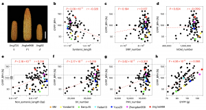 之前研究報(bào)道了雜種優(yōu)勢(shì)與分子遺傳距離(GD)存在弱正相關(guān)關(guān)系。本研究為了研究產(chǎn)量雜種優(yōu)勢(shì)與遺傳變異之間的關(guān)系,首先將基因組劃分為共線性和和非共線性區(qū)域。相關(guān)分析顯示,共線性區(qū)域長(zhǎng)度與GYPP的BPH呈顯著負(fù)相關(guān)(圖5b)。共線性區(qū)域的SNPs和small InDels僅與GYPP的BPH呈弱相關(guān) (圖5c和5d)。相反,非共線性區(qū)域長(zhǎng)度、SV_Number和PAV_Number均與GYPP的BPH呈顯著正相關(guān)(圖5e-g)。其中,SV_Number與GYPP雜種優(yōu)勢(shì)表現(xiàn)出強(qiáng)的相關(guān)性(圖5f)。SVs可以進(jìn)一步分為插入或缺失、串聯(lián)收縮擴(kuò)張和重復(fù)收縮擴(kuò)張。其中,插入缺失與GYPP雜種優(yōu)勢(shì)的相關(guān)性強(qiáng)。綜上所述,表明SVs的數(shù)量對(duì)GYPP的貢獻(xiàn)很顯著,支持了SVs在雜種優(yōu)勢(shì)中起主導(dǎo)作用這一觀點(diǎn)。
