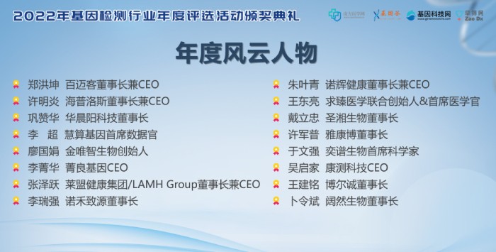 此次評(píng)選,聚焦基因檢測(cè)行業(yè)升級(jí)和變化,以基因檢測(cè)行業(yè)與資本市場(chǎng)為核心,由南方醫(yī)學(xué)網(wǎng)、基因谷、基因科技網(wǎng)等權(quán)威行業(yè)媒體投票選出,此次百邁客生物總裁兼CEO鄭洪坤先生入選,不僅是對(duì)個(gè)人在推動(dòng)基因檢測(cè)行業(yè)高質(zhì)量做出特殊貢獻(xiàn)的認(rèn)可,也是行業(yè)對(duì)百邁客生物2022公司運(yùn)營(yíng)的肯定。