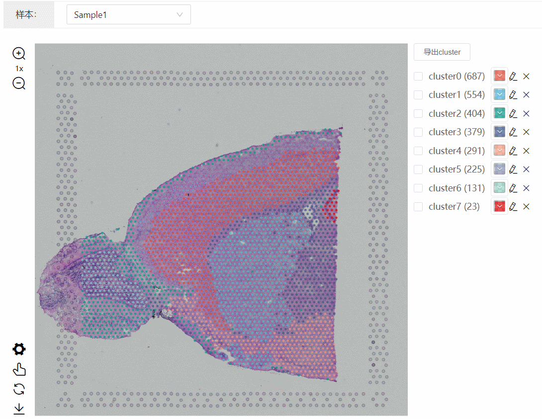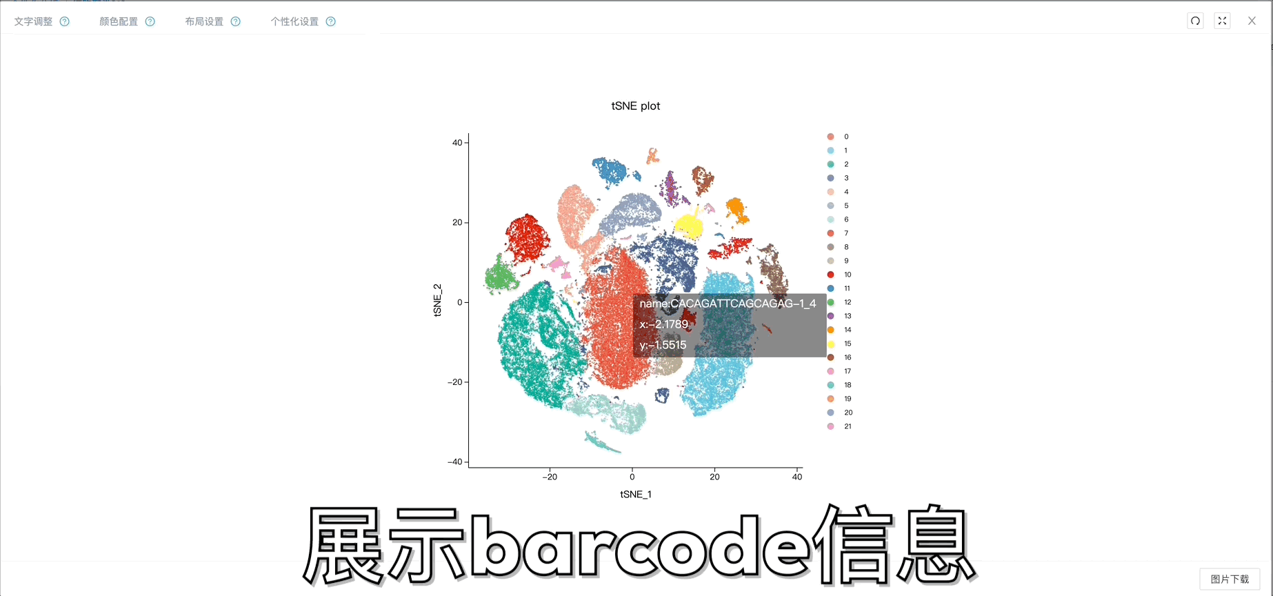 篩選到有效細(xì)胞后,可以基于細(xì)胞的基因表達(dá)矩陣,進(jìn)行細(xì)胞聚類分析。細(xì)胞聚類交互圖可展示UMAP/TSNE圖,調(diào)整點的大小,點配色,文字等交互圖樣式可自定義,具體見下圖及圖中的描述。
