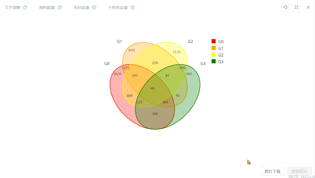 通常會對差異的基因/物質(zhì)做簡單的韋恩圖繪制,也可以對總體的基因/物質(zhì)進(jìn)行繪圖。交互韋恩圖的功能非常靈活,2-5個分組自動繪制韋恩圖,5-32個自動為花瓣圖,支持經(jīng)典韋恩圖、齒輪圖的更換,還支持?jǐn)?shù)字點擊進(jìn)行下級數(shù)據(jù)的二次篩選交互。