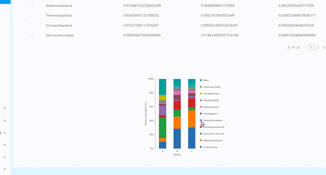百邁客微生物多樣性(擴(kuò)增子)線上分析共擁有20+種基本分析,40+種個性化分析;宏基因組線上分析共擁有20+種基本分析,30+種個性化分析。在這里,展示3款交互式個性化: