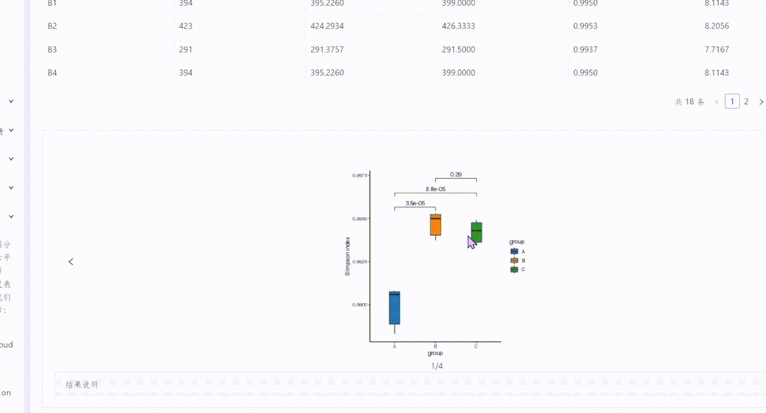 Alpha多樣性用來反映單個樣本的物種豐富度和多樣性,可同時做組間差異分析,支持全圖自定義、線圖/小提琴圖切換、差異p值或*的體現(xiàn)等。