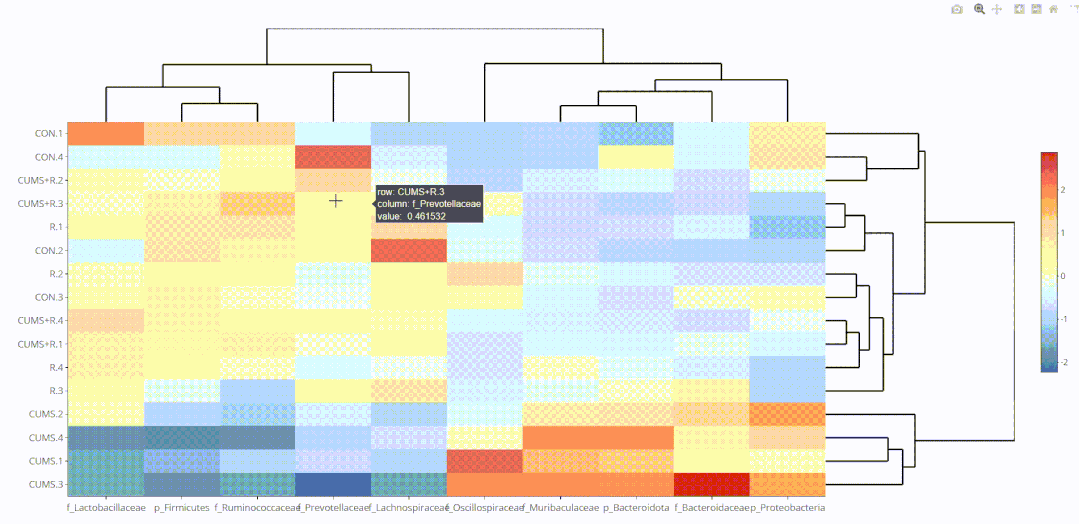 傳統(tǒng)聚類圖常用的參數(shù)均支持(如:橫列是否聚類等),同時鼠標(biāo)懸空放置單元格上會顯示對應(yīng)的源數(shù)據(jù)信息,還支持相關(guān)性熱圖繪制。