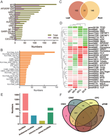 干旱脅迫顯著改變了玫瑰葉片和根中與DEGs相關(guān)的279個轉(zhuǎn)錄因子的表達。MD和SD條件下,MYB、bHLH、b-ZIP、NF-Y、WRKY和AP2家族的TFs顯著富集,其中MYB、AP2和WRKY占主導(dǎo),差異表達的TFs分別為124、46和27個(圖5A)。bHLH和WRKY家族對干旱脅迫的響應(yīng)非常相似。在MD-L處理中,有少量的DEGs、上調(diào)基因,但有大量的下調(diào)基因。相比之下,SD-L處理在這些基因家族中導(dǎo)致了更多的上調(diào)基因,并且適應(yīng)干旱后的葉片和根的干旱響應(yīng)的倍數(shù)變化通常低于SD處理。如圖5C所示,在干旱脅迫下,葉片和根中分別有133和177個TF基因差異表達(圖5 C),其中31個基因是兩個器官共有的且表達模式相似。例如,gene 6966和49627在MD和SD條件下,在葉片和根中都是表達上調(diào)。一些蛋白激酶家族,包括RLK/Pelle_DLSV(142個成員,玫瑰轉(zhuǎn)錄組中較大的家族)和RLK/Pelle_ RLCK -VIIa -2(101個成員)(圖5 B),在玫瑰轉(zhuǎn)錄組中負責蛋白激酶的大小。
