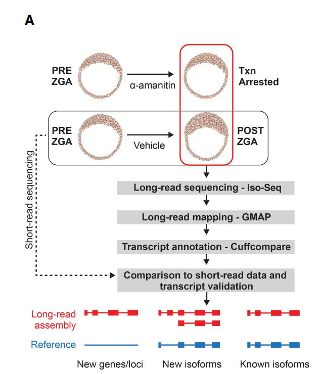 3、全長轉(zhuǎn)錄組測(cè)序:選取正常的胚胎和 RNA 聚合酶抑制劑α-鵝膏毒素處理的胚胎進(jìn) 行三代全長轉(zhuǎn)錄組測(cè)序。