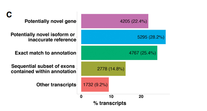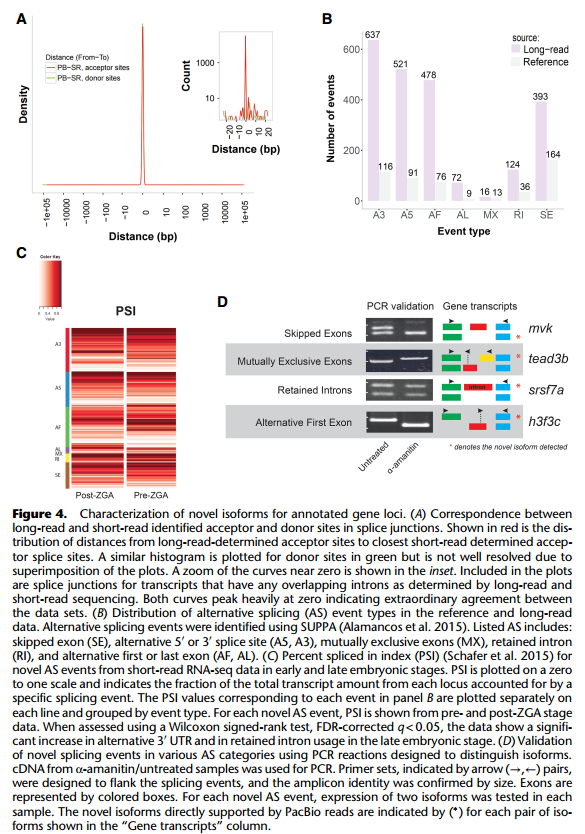 作者接著對(duì)全長轉(zhuǎn)錄組對(duì)已注釋基因鑒定到的未記錄的轉(zhuǎn)錄本的可變剪切形式的研究。 由于斑馬魚參考基因組對(duì)可變剪切的注釋較少,文章使用短讀長的轉(zhuǎn)錄組數(shù)據(jù)對(duì)可變剪切位 點(diǎn)進(jìn)行驗(yàn)證。作者使用 STAR 軟件分析轉(zhuǎn)錄組數(shù)據(jù),預(yù)測(cè)了 3000 個(gè)可變剪切位點(diǎn),其中 99% 可以與全長轉(zhuǎn)錄本數(shù)據(jù)吻合。剪接位點(diǎn)的這種近乎完美的一致性支持證明了全長轉(zhuǎn)錄組鑒定 的外顯子 – 內(nèi)含子邊界的準(zhǔn)確性,并強(qiáng)烈支持新檢測(cè)到的可變剪接形式的有效性。通過全 長轉(zhuǎn)錄組共發(fā)現(xiàn)了 2000 種新型可變剪切類型,其中已注釋基因的新型可變剪切共 1835 中, 平均每個(gè)基因的可變剪切類型提升 50%。