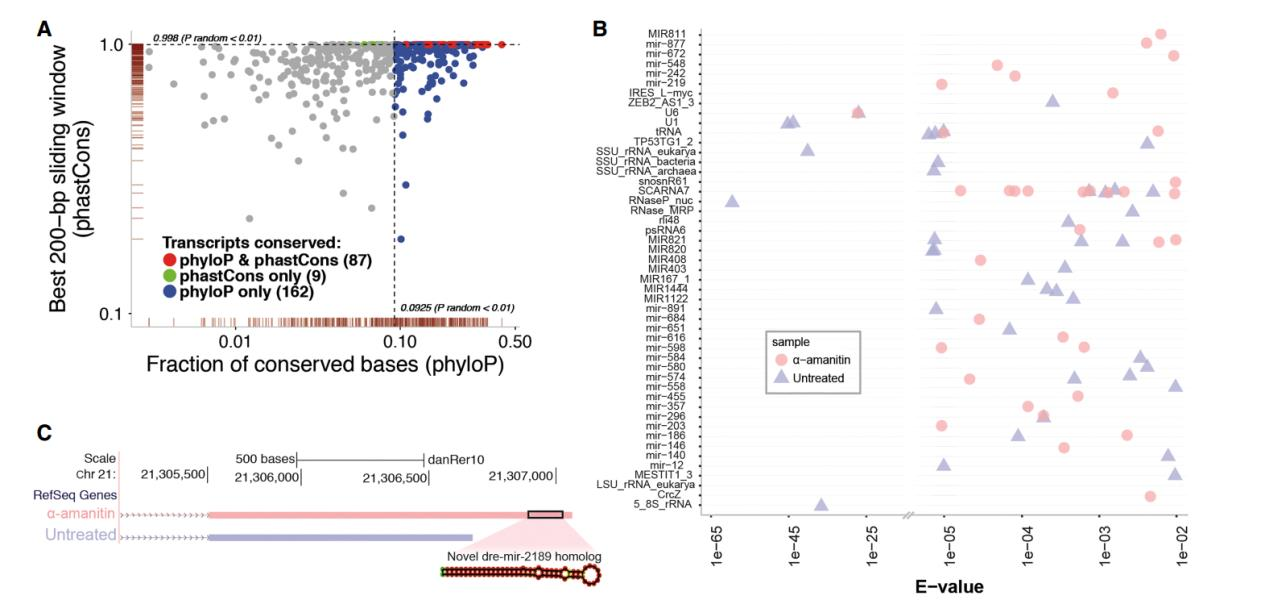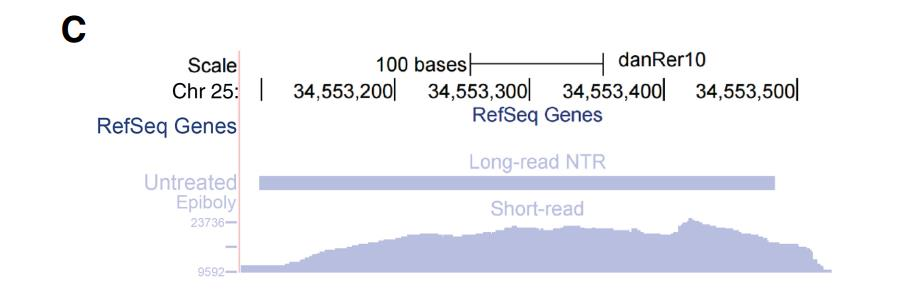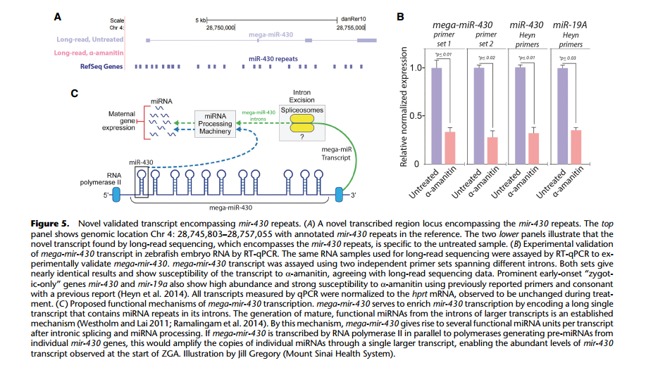 通過全長轉(zhuǎn)錄組鑒定到的大量新轉(zhuǎn)錄本中包括了一種重要 miRNA- miR-430,mir-430 可能是第一個(gè)表達(dá)的合子基因,它通過對(duì)所有母源轉(zhuǎn)錄基因進(jìn)行的特異性沉默和降解將合子 基因的啟動(dòng)和母體程序的消除連接起來。在以前的研究中,對(duì)其功能研究較多,而對(duì)于 miR-430 的來源研究較少。作者鑒定到了一個(gè)新的跨越 9kb 基因組序列的四外顯子轉(zhuǎn)錄本, 該轉(zhuǎn)錄本重疊 22 個(gè) mir-430 重復(fù)序列,被稱為“mega-mir-430”。 在α-amanitin 處理中沒 有檢測(cè)到 mega-mir-430,并通過 qPCR 進(jìn)行了驗(yàn)證,推斷它來源于合子基因組。從每個(gè) mega-mir-430 轉(zhuǎn)錄本產(chǎn)生多個(gè) mir-430 的拷貝,這個(gè)發(fā)現(xiàn)解釋了合子基因激活時(shí) mir-430 高表達(dá)的原因。