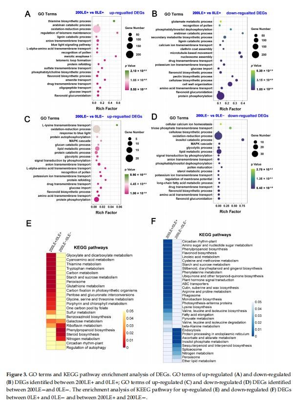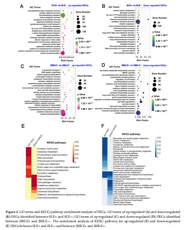 E.gansuensis上調1269個基因,下調1195個0LE+基因(葉E+植物在0mMNaCl下)與0LE-(E-植物在0mMNaCl下的葉子)相比。類似地,E.gansuensis誘導844個基因并抑制200LE+(E+植物的葉子)的973個基因在200mMNaCl下)與200LE-(E-植物的葉子在200mMNaCl下)相比(圖1)。目前的結果表明在NaCl脅迫下E.gansuensis對基因的調控有巨大的影響與200mMNaCl相比。對0LE+和0LE-之間的DEGs進行GO富集分析發(fā)現,E.gansuensis主要誘導“鈉離子跨膜轉運”、“胚胎后發(fā)育的正調控”、“蛋白質磷酸化”、“光系統(tǒng)化學計量調整”和“谷氨酸代謝過程”(圖2A)。此外,GO富集分析表明,類別“類黃酮葡萄糖醛酸化”、“類黃酮生物合成過程”、“氧化-還原”過程”和“陰離子跨膜轉運”在下調中富集E.gansuensis在0mMNaCl濃度下的DEGs(圖2B)。這些結果暗示E.gansuensis重新編排了植物生理學和重要生物學的許多方面提高寄主植物的競爭力。GO富集分析在200LE+和200LE?之間的DEGs表明,E.gansuensis主要誘導“蛋白質磷酸化”、“氧化還原過程”、“油菜素類固醇生物合成過程”、“細胞鈣離子穩(wěn)態(tài)”和“L-谷氨酸轉運”(圖2C);此外,GO富集分析發(fā)現“蛋白質磷酸化”的類別,“果糖6-磷酸代謝過程”、“類黃酮生物合成過程”和“MAPK”在200mMNaCl濃度下,E.gansuensis在下調的DEG中富集級聯(lián)”(圖2D)。我們的研究結果表明,E.gansuensis通過激活細胞信號轉導促進宿主在脅迫環(huán)境下的生長,維持平衡。促進ROS、Ca2+信號和油菜素類固醇(BR)的生物合成,它們在抗壓過程中起作用。