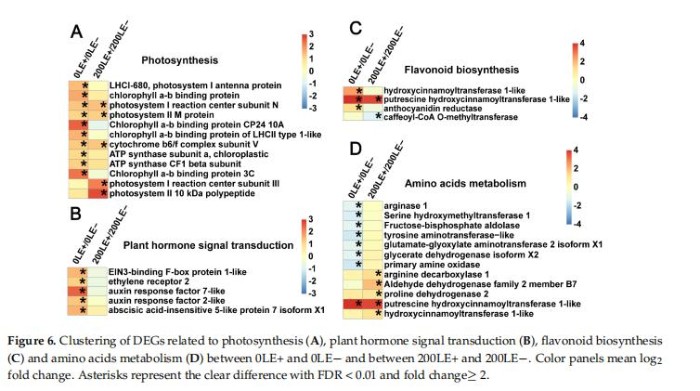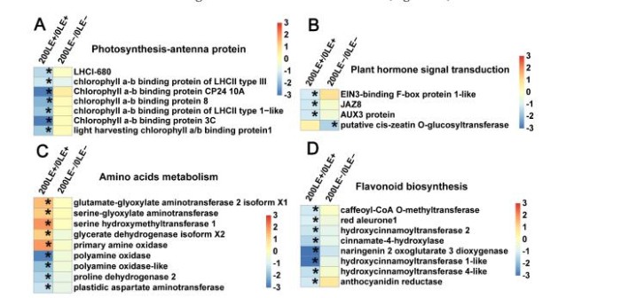 E.gansuensis顯著激活10個基因和5個光合作用基因分別為0mM和200mMNaCl濃度下。E.gansuensis的作用寄主植物的光合作用基因更明顯在0mMNaCl下比200mM氯化鈉(圖6A)。此外,E.gansuensis顯著激活植物的五個信號傳導基因在0mMNaCl濃度下;這些基因包括乙烯信號通路的兩個基因、生長素信號通路的兩個基因和脫落酸信號通路的一種基因。然而,E.gansuensis沒有顯著激活植物激素信號轉導基因在200mMNaCl濃度13下(圖6B),這意味著NaCl的影響大于E.gansuensis在植物激素基因表達方面的研究。E.gansuensis顯著下激活植物激素信號轉導基因在0mMNaCl濃度下,但E.gansuensis在200mMNaCl濃度下顯著調控兩個類黃酮生物合成基因(圖6C)。E.gansuensis顯著抑制氨基的八個基因在0mMNaCl濃度和E.gansuensis的酸代謝顯著激活下激活植物激素信號轉導基因在200mMNaCl濃度下的(圖6D)。更遠,E.gansuensis顯著下調甘氨酸、絲氨酸和蘇氨酸代謝,以及作為色氨酸代謝在0mMNaCl濃度下。E.gansuensis顯著下調賴氨酸降解,上調精氨酸和脯氨酸代謝在200mMNaCl下。因此,很可能,E.gansuensis通過調節(jié)宿主氨基酸代謝來提高A.inebrians的耐鹽性。