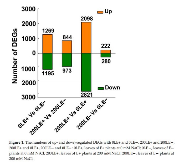 進一步闡明E.gansuensis在NaCl脅迫下對寄主植物生長的分子機制,E+和E-A.inebrians葉片(28天齡)的轉錄組通過Illumina測序進行分析。E+A.inebrians和E-A.inebrians用含0mMNaCl和200mMNaCl濃度處理。閾值FDR≤0.01和FC≥2用于確定DEG(差異表達基因)。結果顯示響應E.gansuensis的轉錄本發(fā)生顯著變化,在0mMNaCl和200mMNaCl濃度下的分別發(fā)生2464和1817DEGs(圖1)。此外,在NaCl脅迫下,轉錄本發(fā)生了顯著變化,E+葉子的4919個DEG。然而,一個小的轉錄組變化發(fā)生在對NaCl脅迫的響應,E-葉為502DEG(圖1)。