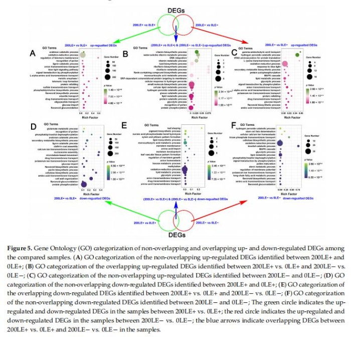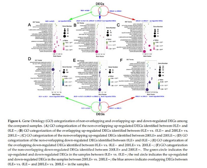 Venn結果顯示E.gansuensis僅上調1135DEG在0mMNaCl濃度下的LE+和LE-之間,E.gansuensis在200mMNaCl脅迫下僅上調LE+和LE-之間的710DEG;此外,134DEG的LE+與LE-在E.gansuensis在0mMNaCl和200mMNaCl(補充圖S4A)。同樣,E.gansuensis在0mMNaCl和E.gansuensis僅下調LE+和LE-之間的928DEG僅在A.inebrians中下調LE+和LE-之間的706DEG作為響應至200mMNaCl(補充圖S4B)。分析結果表明這些特殊的上調或下調的LE+與LE-的DEG的GO富集0mMNaCl和200mMNaCl分別顯示磷酸化信號,次生代謝物的合成和轉運,以及離子跨膜轉運A.inebrians主要富集于E.gansuensis獨特的上調DEGs在0mMNaCl濃度下(圖4A)。GO富集分析結果表明A.inebrians的“蛋白質磷酸化”、“類黃酮葡萄糖醛酸化”、“氨基酸跨膜轉運”、“果糖6-磷酸代謝過程”、“類黃酮生物合成過程”和“磷酸化信號轉導”主要在200mM甘肅E.gansuensis獨特的上調DEG中富集NaCl濃度(圖4C)。細胞信號轉導通路(“蛋白磷酸化”和“細胞表面受體信號通路”)、“類黃酮生物合成A.inebrians的“過程”、“細胞表面受體信號通路”、“葡萄糖輸入”、“陰離子跨膜轉運”和“細胞分裂”主要富集于E.gansuensis在0mMNaCl和200mMNaCl濃度下共享上調的DEG(圖4B)。E.gansuensis主要僅抑制“黃酮類葡萄糖醛酸化”、“葡萄糖輸入”、“長鏈脂肪酸代謝過程”、“黃酮類生物合成過程”、“陰離子跨膜轉運”和“氧化還原過程”的A.inebrians,主要在獨特的下調DEG中富集由E.gansuensis在0mMNaCl濃度下(圖4D)?!暗鞍踪|磷酸化”、“果糖6-磷酸代謝過程”、“黃酮類葡萄糖醛酸化”、“通過果糖-6-磷酸進行糖酵解過程”,“類黃酮生物合成過程”,“調節(jié)蛋白磷酸酶2A型活性”,“鉀離子跨膜”A.inebrians的運輸”和“MAPK級聯(lián)”主要富集于獨特的甘肅大腸桿菌在200mMNaCl濃度下下調DEG(圖4F)。細胞信號轉導(“蛋白質磷酸化”和“細胞表面受體信號通路”)、次生代謝產物(“類黃酮”生物合成過程”、“絲氨酸家族氨基酸生物合成過程”和“細胞氨基酸代謝過程”)和“過氧化氫分解代謝過程”A.inebrians主要在0mMNaCl和200mMNaCl的E.gansuensis共享的下調DEG中富集(圖4E)。