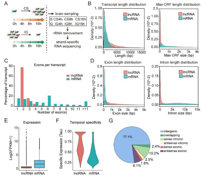 研究發(fā)現(xiàn)大約78%的lncRNA包含2個(gè)外顯子,而mRNA中包含的外顯子數(shù)量為1至120(圖1C)。因此,lncRNA的外顯子明顯長(zhǎng)于mRNA的外顯子(平均長(zhǎng)度1142bpvs.263bp,圖1D,左)。同時(shí),lncRNA的內(nèi)含子明顯短于mRNA的內(nèi)含子(平均長(zhǎng)度:10086bpvs.12442bp,圖1D,右)。表達(dá)水平分析表明,lncRNA的總體表達(dá)水平明顯低于mRNA的表達(dá)水平(平均值為0.6vs.1.9;圖1E)。但是,表達(dá)特異性分析表明,lncRNA的表達(dá)受時(shí)間限制的程度要高于mRNA(平均值為0.672對(duì)0.436圖1F)?;谙鄬?duì)于mRNA的lncRNA基因組位置,蝗蟲lncRNA被分類為基因間、重疊區(qū)、有義內(nèi)含子、反義內(nèi)含子、有義外顯子和反義外顯子。蝗蟲77%以上的lncRNA是長(zhǎng)基因間的ncRNA(lincRNA,圖1G)。這些結(jié)果表明,蝗蟲lncRNA與mRNA在結(jié)構(gòu)和表達(dá)上有很大不同?;认xlncRNAs更長(zhǎng),具有更少但更長(zhǎng)的外顯子和更短的內(nèi)含子。此外,lncRNA的表達(dá)模式顯示出比mRNA更高的時(shí)間特異性。