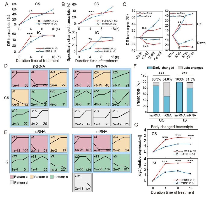 為了進(jìn)一步分析lncRNA和mRNA的表達(dá)模式,使用了短時(shí)間序列表達(dá)挖掘器(ShortTime-seriesExpressionMiner,STEM)對(duì)基于表達(dá)的轉(zhuǎn)錄本進(jìn)行聚類。在CS期間,將214個(gè)lncRNA和242個(gè)mRNA分別分為8個(gè)和9個(gè)重要的表達(dá)譜(圖3D)。其中l(wèi)ncRNA表達(dá)譜15以及mRNA表達(dá)譜15、13和16直到群居化處理后8或16小時(shí)才改變。這些配置文件稱為后期更改的配置文件(模式d)。與后期更改的配置文件相反,早期更改的配置文件以4小時(shí)時(shí)間點(diǎn)開始的轉(zhuǎn)錄表達(dá)變化為特征。根據(jù)4小時(shí)后的表達(dá)變化,將早期變化的輪廓細(xì)分為模式a(早期變化)、模式b(早期中變化)和模式c(可持續(xù)變化)。在IG過(guò)程中,269個(gè)lncRNA和639個(gè)mRNA分別聚集成6個(gè)和7個(gè)顯著表達(dá)譜。所有l(wèi)ncRNA配置文件均為早期變化(圖3E)。在mRNA表達(dá)譜中,有6個(gè)是早期改變的,而譜12是晚期改變的。在CS和IG期間,lncRNA的聚類分布圖的數(shù)量與mRNA的分布無(wú)明顯差異。但是,通過(guò)計(jì)算譜圖中的轉(zhuǎn)錄本數(shù)量,發(fā)現(xiàn)早期改變的lncRNA的百分比比CS中的mRNA的百分比高61.1%(88.3%vs.54.8%,圖3F)。同樣,IG中早期改變的lncRNA的百分比高于IG中的mRNA(100%vs.81.3%,圖3F)。因此,lncRNA比mRNA對(duì)散居化和群居化處理的反應(yīng)更快。在CS中,早期改變的lncRNA的表達(dá)變化速率快于285個(gè)mRNA的表達(dá)變化速率(0.55vs.0.24)和IG(0.77vs.0.39)(圖3G)。因此,早期改變的lncRNA的比例和表達(dá)變化率高于早期改變的mRNA。因此,蝗蟲lncRNA比mRNA對(duì)種群密度的變化更敏感。