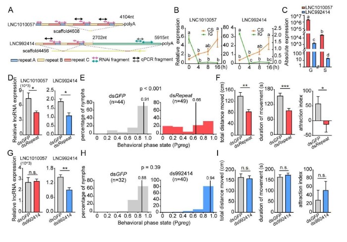 為為了驗(yàn)證LNC1010057和LNC992414在蝗蟲型變中的功能,進(jìn)行了一系列分子生物學(xué)實(shí)驗(yàn)。首先,克隆了在LNC1010057和LNC992414基因座中鑒定出的長(zhǎng)的轉(zhuǎn)錄本。LNC1010057由重復(fù)的A、B和C元素組成,這些元素依次分布并重復(fù)4次,但C元素重復(fù)三次(圖5A)。序列比對(duì)證明LNC992414在5’端與LNC1010057共享相似的重復(fù)序列,但是它們是從不同的基因組基因座轉(zhuǎn)錄而來(lái)的(圖5A)。盡管LNC992414的定量表達(dá)水平可以通過(guò)特異性引物檢測(cè),但LNC1010057的表達(dá)水平為重復(fù)元件的總表達(dá)水平。如預(yù)期的那樣,LNC1010057和LNC992414的表達(dá)模式極為相似。在CS期間,兩種lncRNA的表達(dá)持續(xù)增加,并且在16h幾乎增加了四倍(圖5B)。在IG期間,4h后表達(dá)水平顯著下降,之后保持相對(duì)穩(wěn)定(圖5B)。LNC1010057和LNC992414之間的序列結(jié)構(gòu)和表達(dá)模式的相似性表明它們是同源的lncRNA。但是,實(shí)時(shí)qPCR分析表明,在散居型和群居型蝗蟲的大腦中,LNC1010057的表達(dá)水平比LNC992414的表達(dá)水平高約1000倍(圖5C)。其次,為了測(cè)試LNC1010057和LNC992414是否參與蝗蟲型變調(diào)節(jié),在通過(guò)RNAi抑制蝗蟲大腦中的表達(dá)后進(jìn)行了行為分析。顯著降低LNC1010057的表達(dá)水平(7470對(duì)3764610)和LNC992414(1.9vs.1.0)(圖5D)后行為分析表明,群居型蝗蟲其行為顯著改變?yōu)樯⒕訝顟B(tài)(圖5E)。此外,多個(gè)與型有關(guān)的行為參數(shù)發(fā)生了變化??傄苿?dòng)距離(TDM)和總移動(dòng)持續(xù)時(shí)間(TDMV)顯著降低(圖5F),但是,移動(dòng)速度沒(méi)有區(qū)別。同時(shí)群居蝗蟲的特定喜好行為顯著下降(58.3對(duì)-13.5圖5F)。但LNC992414表達(dá)降低并未引起從群居狀態(tài)到散居狀態(tài)的轉(zhuǎn)變(圖5G和H)。與對(duì)照相比,與型相關(guān)的行為參數(shù)(包括運(yùn)動(dòng)和特定物種的優(yōu)選行為)沒(méi)有差異(圖5I)。LNC992414的RNAi實(shí)驗(yàn)不會(huì)引起行為變化,因此排除了LNC992414調(diào)節(jié)蝗蟲型變的可能性。這些結(jié)果表明是LNC1010057而不是LNC992414潛在地調(diào)節(jié)了蝗蟲的型變。