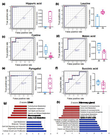 MG中的馬來(lái)酸(AUC=0.972,log2FC=-2.88;圖3d),鄰苯三酚(AUC=0.833,log2FC=6.26;圖3e)和琥珀酸(AUC=0.833,log2FC=-3.01;圖3f)是分離AH和CS動(dòng)物的潛在生物標(biāo)記。通過(guò)IPA識(shí)別,CS喂養(yǎng)的奶牛的肝臟中關(guān)鍵顯著下調(diào)的途徑是氨基酸(AA)代謝(P=1.66E-07,Z評(píng)分=-3.12),糖異生(P=3.86E-08,Z評(píng)分=-2.61))以及肝臟中的維生素和礦物質(zhì)代謝(P=1.47E-15,Z分?jǐn)?shù)=-2.42)(圖3g);MG中AAs的攝取(P=1.49E-08,Z分?jǐn)?shù)=-2.77),攝取L-AA(P=4.52E-07,Z分?jǐn)?shù)=-2.41),碳水化合物代謝(P=2.10E-11,Z分?jǐn)?shù)=-2.24)和葡萄糖-6-磷酸的氧化(P=1.01E)-11,Zscore=-2.21)途徑顯著下調(diào)。(圖3h)
