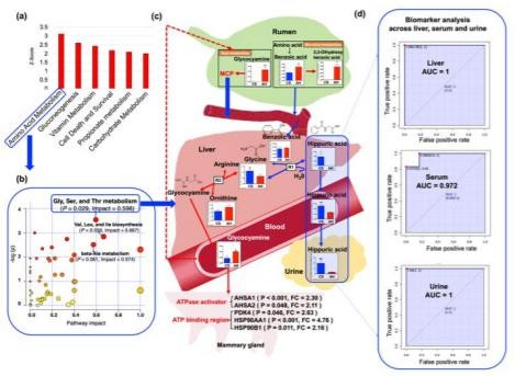 在兩個(gè)動(dòng)物組之間,AA代謝途徑是肝臟中最顯著不同的途徑(圖5a)。對(duì)AA代謝途徑的進(jìn)一步影響分析表明,亞途徑,甘氨酸,絲氨酸和蘇氨酸代謝的影響較大(圖5b,P=0.029,影響值=0.597)。因此,我們對(duì)肝臟中與甘氨酸相關(guān)的反應(yīng)進(jìn)行了徹底的分析,并研究了它們與體內(nèi)體液中代謝物的關(guān)系。綜合比較表明,苯甲酸,糖胺(GAA)和HCA在整個(gè)人體的AA代謝中起著關(guān)鍵作用,當(dāng)母牛飼喂CS時(shí),隨后會(huì)影響牛奶的合成(圖5c)。用CS喂養(yǎng)的奶牛肝臟中甘氨酸和HCA的濃度更高,進(jìn)一步支持了我們的推測(cè),即瘤胃(微生物)和肝臟(宿主)中的苯甲酸代謝都可能受到影響(圖5c)。對(duì)肝,血清和尿液進(jìn)行的HCA生物標(biāo)志物分析顯示出一致的結(jié)果(圖5d),這進(jìn)一步表明,從肝臟到尿液的HCA循環(huán)是CS下牛奶產(chǎn)量變化的生物標(biāo)志物。