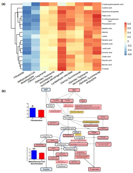 瘤胃液中55種明顯不同的代謝產(chǎn)物中,CS喂養(yǎng)的動(dòng)物中49種的代謝產(chǎn)物含量較低,通過(guò)將微生物分類群相對(duì)豐度,碳水化合物代謝中的基因豐度和17種高度豐富的微生物代謝物相關(guān)聯(lián),研究了微生物代謝物與微生物之間的關(guān)系。核心宏基因組相關(guān)元素包括三個(gè)細(xì)菌屬(纖維桿菌,琥珀酸桿菌和螺旋體)),三種細(xì)菌種類(解淀粉琥珀酸桿菌,琥珀酸梅毒螺旋體和嗜糖鏈球菌)和三種微生物功能(甲基丙二酰輔酶A脫羧酶,琥珀酸脫氫酶和乳醛還原酶)(圖2a)。琥珀酸脫氫酶基因和解淀粉鏈球菌的相對(duì)豐度分別與16種代謝物(r介于0.43至0.68,P<0.1)和15種代謝物(r介于0.43至0.76,P<0.1)呈正相關(guān)。對(duì)上述瘤胃代謝組和代謝組的綜合分析顯示,當(dāng)給動(dòng)物喂食CS時(shí),瘤胃中產(chǎn)生較低的丙酸根和較高的乙酸鹽的潛在機(jī)理(圖2b)。