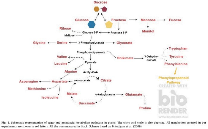 采集“Katerini 53”,“Xanthi 81”和“Smirrni 3B”葉片樣品,并使用氣相色譜GC-MS 和 LC-MS / MS 方法進(jìn)行代謝分析?;蛐皖A(yù)先鑒定為不同的色譜模式,共有 78 種代謝化合物(包括糖,氨基酸,有機(jī)酸)差異積累,如圖 3 所示。詳細(xì)的非靶向 GC-MS 代謝組學(xué)分析用于鑒定煙葉中產(chǎn)生的大多數(shù)主要代謝產(chǎn)物。在本研究中,所測(cè)得的最豐富的可溶性糖是果糖,葡萄糖,半乳糖和蔗糖。在果糖和蔗糖中檢測(cè)到統(tǒng)計(jì)學(xué)差異;“Katerini 53”中的果糖含量更高,而“Smierni 3B”中的蔗糖含量更高?!癒aterini 53”與其它兩個(gè)品種相比葡萄糖和半乳糖水平較高,差異無(wú)統(tǒng)計(jì)學(xué)意義。在可溶性醇中,兩個(gè)豐富的代謝產(chǎn)物是山梨糖醇和肌醇,但在品種之間未檢測(cè)到統(tǒng)計(jì)學(xué)上的顯著差異。這三個(gè)品種中的蘋(píng)果酸含量沒(méi)有任何統(tǒng)計(jì)上顯著不同。“Xanthi 81”葉子的氨基酸含量最高,但谷氨酸和 γ-氨基丁酸(GABA)除外。GABA 和脯氨酸是煙葉中的主要氨基酸。與其他兩個(gè)品種相比,“Smirrni 3B”中的 GABA 水平明顯更高。’Smirrni 3B’和’Xanthi 81’中的脯氨酸水平較高,而“Katerini 53”的脯氨酸水平最低。在“Smirrni 3B”中檢測(cè)到了高濃度的甘氨酸和絲氨酸這兩種必需氨基酸。煙草生物堿在根部合成,然后轉(zhuǎn)運(yùn)到葉片。生物堿、尼古丁與植物抗草食動(dòng)物防御有關(guān)。在三個(gè)品種中檢測(cè)到的尼古丁濃度在統(tǒng)計(jì)學(xué)上有顯著差異。結(jié)果表明,“Xanthi 81”的尼古丁濃度最高,而“Smirrni 3B”的尼古丁濃度最低。與“Katerini 53”相比,“Xanthi 81”中腐胺的含量有所降低,但其濃度仍高于“Smirrni 3B”。鑒定了所有擬參與煙草中尼古丁生物合成的相應(yīng)基因,但僅發(fā)現(xiàn)少數(shù)幾個(gè)在成熟葉片中表達(dá)。然而,基因 XS 和 QPT(三分之二)在“Xanthi 81”中表達(dá)較高。與其它兩個(gè)品種相比,這與“Xanthi 81”葉片中較高的尼古丁含量相關(guān),這表明它可能是遺傳控制的。