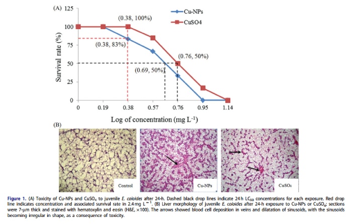 石斑魚被暴露在不同濃度(1.6,1.6,2.4,3.7,5.8或9.0毫克的cu l 1)的cu-np中。這些濃度是根據(jù)初步實(shí)驗(yàn)選擇確定。在暴露期間,魚不被喂食,死魚被移除。急性暴露時(shí)間持續(xù)24小時(shí),并在結(jié)束時(shí)評估魚的死亡率。