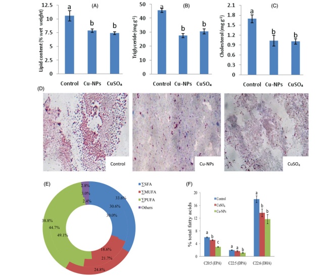 與對照組相比,在兩種銅形式下,肝臟中脂類、甘油三酯和膽固醇含量均顯著降低,但兩種銅形式下相比無顯著性差異(P>0.05)。正常脂質(zhì)積累(紅色染色表明的脂滴)在對照組中明顯增加,而Cu-NPS或硫酸銅暴露則減少了脂滴的數(shù)量(圖5(D)),任何一種銅暴露均降低了總多不飽和脂肪酸,但總單不飽和脂肪酸和總飽和脂肪酸(Psfa)較對照組增加,而在Cu-NPS中,多不飽和脂肪酸(圖5(E))的作用更為明顯(圖5(E))。與對照相比,cu-nps或硫酸銅暴露后,脂肪酸、二十碳五烯酸(epa,c20:5)、二十二碳六烯酸(dha,c22:6)和二十二碳五烯酸(dpa,c22:5)均下降,而cu-nps中脂肪酸組分的含量比cu-nps明顯增加(圖5(F))。