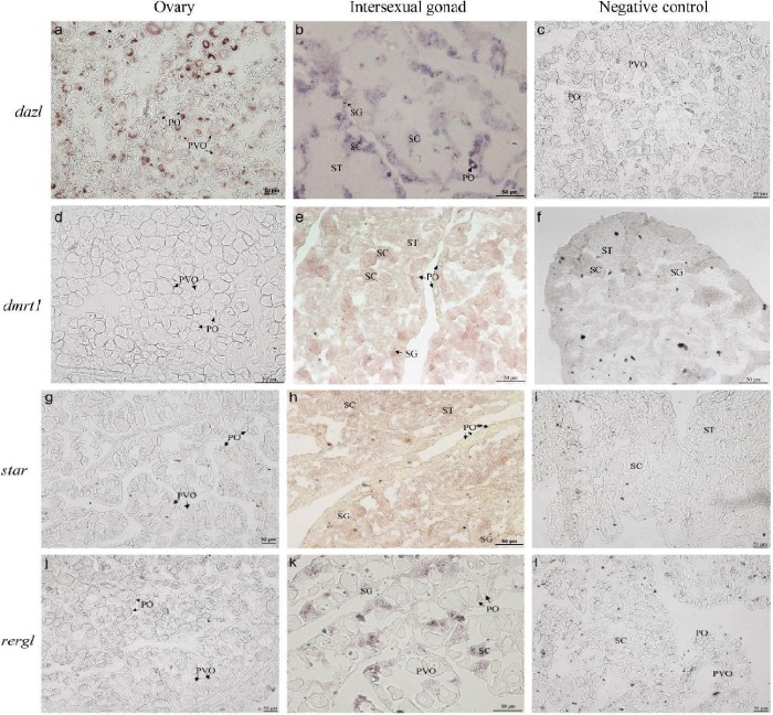 用原位雜交(ISH)技術(shù)分析了不同性腺階段性相關(guān)基因(dazl、Dmrt1、star、rergl)的定位。dazlmRNA僅限于斜帶石斑魚(yú)的雌性和雄性生殖細(xì)胞(卵母細(xì)胞、SG和SC)表達(dá)(圖9a、b),結(jié)果表明dazl是一種生殖細(xì)胞標(biāo)記物,在睪丸中高表達(dá),這與其他物種中dazl的表達(dá)一致。在自然雌性的卵巢中未檢測(cè)到Dmrt1信號(hào)(圖9d)。性逆轉(zhuǎn)后期的性腺有豐富的雄性生殖細(xì)胞SG、SC和ST,帶有dmrt1陽(yáng)性信號(hào),而卵母細(xì)胞沒(méi)有dmrt1信號(hào)(圖9e),因此dmrt1可以被認(rèn)為是斜帶石斑魚(yú)的生殖細(xì)胞標(biāo)記。star作為合成類(lèi)固醇激素途徑中的限速酶,其在雄性斜帶石斑魚(yú)的睪丸中特異表達(dá),而在卵母細(xì)胞中未檢測(cè)到star信號(hào)(圖9g)。此外,發(fā)現(xiàn)starmRNA在SG、SC和ST中表達(dá)(圖9h)。rerglmRNA僅在雄性生殖細(xì)胞中檢測(cè)到(圖9j,k),這與RT-qPCR結(jié)果一致,暗示其在性別調(diào)節(jié)中的潛在作用。dazl、dmrt1、star和rergl的雜交探針作為對(duì)照實(shí)驗(yàn)顯示性腺中沒(méi)有信號(hào)(圖9c、f、I、l)。