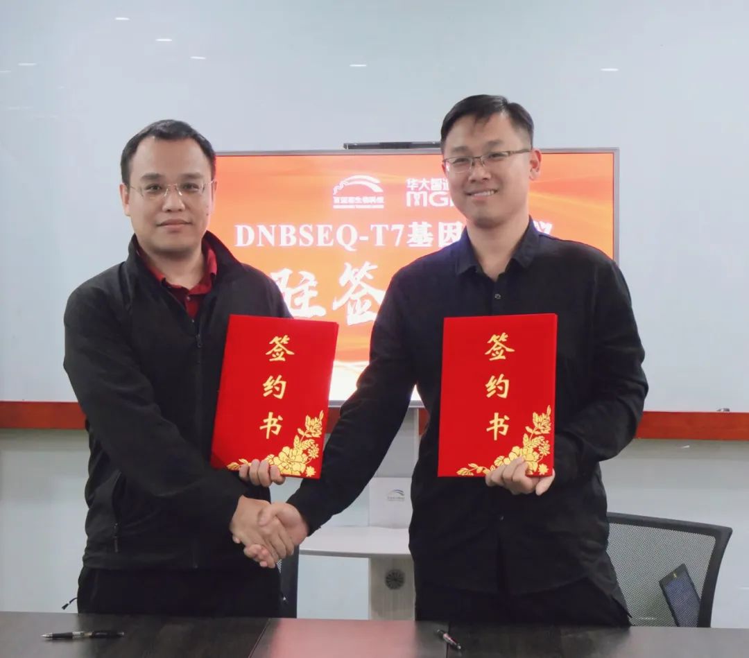 華大智造中國(guó)營(yíng)銷中心全國(guó)大客戶總監(jiān)趙明(左)與百邁客生產(chǎn)研發(fā)副總裁張雪川(右)