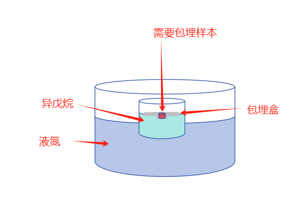 - 用異戊烷(足以完全浸沒組織)填充三分之二的金屬燒杯,然后放入液氮杜瓦瓶中 (液氮與異戊烷保持相同的水平面)以充分接觸,孵育5- 10分鐘,時間不宜太久,防止異戊烷凝結(jié) 。(若無異戊烷及液氮可使用干冰包埋)