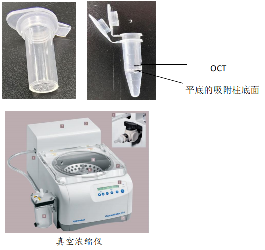 3)冰上預(yù)冷75% OCT包埋劑溶液(5mlOCT+2.5ml滅菌水顛倒混勻),1.5ml離心管中加入1ml 75%OCT,將植物組織浸潤在其中,將平底的無吸附膜的吸附柱放入1.5ml離心管中,以防止抽真空過程組織上浮在OCT表面,打開所有管蓋,置于真空濃縮儀中(注意配平)。室溫抽真空10min,摸索設(shè)置成V-AQ,促進OCT溶液充分包裹和進入組織空隙中,保證OCT填充包埋組織的完整性。如下圖: