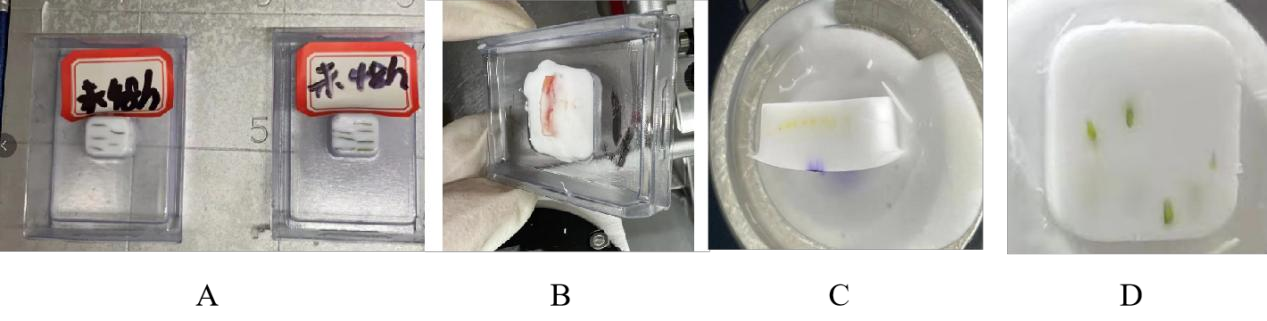 - 培養(yǎng)基培養(yǎng)樣本:在無菌超凈臺中取出組織,去除組織表面附著的培養(yǎng)基,用超純水將組織表面清洗干凈。從活體植株上取下新鮮目標區(qū)域組織置于培養(yǎng)皿中,利用4℃預(yù)冷的鑷子和剪刀將目標區(qū)域外的組織結(jié)構(gòu)盡量去除,若組織內(nèi)部存在空腔盡可能修剪組織暴露空腔,之后將組織裁剪成<5*6.5mm(10x Genomics)/6.8*6.8mm(百創(chuàng)S3000)的小塊;