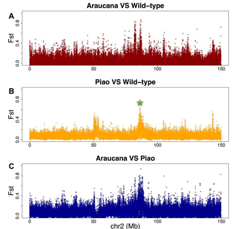 瓢雞無尾表型的定位區(qū)間,與之前報道的美國阿勞卡納雞品種無尾表型區(qū)間非常接近但精細定位區(qū)間沒有重疊。對瓢雞、阿勞卡納以及其他具有正常尾巴的多個種群的群體基因組分析顯示,雖然這兩個無尾品種在2號染色體的相同區(qū)域受到選擇,但選擇具有品種差異性。在阿勞卡納雞2號染色體上識別的兩個候選SNP在無尾瓢雞中并不存在,并且在瓢雞中證實的致因缺失突變在阿勞卡納雞也不存在。即瓢雞和阿勞卡納雞無尾特征可能源自不同的致病突變。