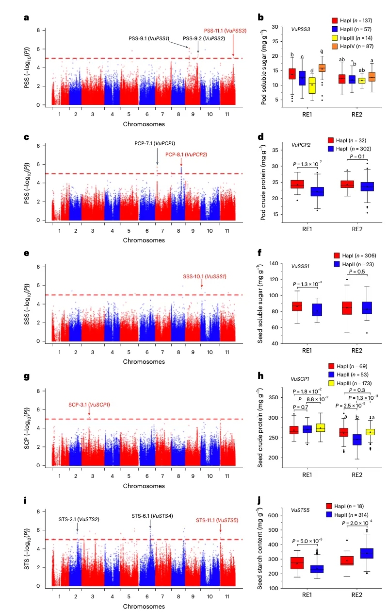可溶性糖、總淀粉和粗蛋白質(zhì)含量是豆科作物的三個基本品質(zhì)性狀。GWAS分析檢測到三個信號與嫩莢可溶性糖含量(PSS)顯著相關(guān)(圖6a),其中VuPSS1可能是功能相關(guān)基因,VuPSS2可能通過其順式調(diào)控元件影響PSS含量,VuPSS3-HapIV單倍型是PSS的有利單倍型。嫩莢粗蛋白含量(PCP)差異可能與有利單倍型VuPCP1-HapII和VuPCP2-HapI有關(guān)。籽??扇苄蕴牵⊿SS)含量相關(guān)的信號(圖6e)包含一個FAR1-related SEQUENCE (FAR1)家族蛋白(VuSSS1),F(xiàn)AR1在淀粉合成以及糖的運輸和降解中起作用,VuSSS1-HapI為其有利單倍型(圖6f)。VuSCP2-HapIII和VuSCP2-HapIV通常導致更高的籽粒粗蛋白含量(SCP),VuSCP1和VuSCP2相似的表達模式提示它們可能影響種子發(fā)育中期的SCP表型。籽??偟矸酆浚⊿TS)GWAS分析檢測到5個相關(guān)信號(圖6i),STS-2.1中的VuSTS2含有一個MYB轉(zhuǎn)錄因子,STS-11.1中的VuSTS5編碼一個磷脂酰絲氨酸脫羧酶,該酶可能影響植物發(fā)育的關(guān)鍵調(diào)節(jié)因子磷脂酰絲氨酸。兩種基因的不同單倍型在兩種環(huán)境中表現(xiàn)出不同的STSs,這表明它們在很大程度上受環(huán)境條件的影響(圖6j)。STS-3.1中的VuSTS3編碼了一個未知的蛋白,其中VuSTS3-HapIII對STS的影響最大。STS-6.1含有一個NAD依賴性蛋白去乙?;竀uSTS4,可能影響淀粉的生物合成和調(diào)控,而VuSTS4-HapI對STS的作用更強。以上結(jié)果有潛力成為糧用豇豆和菜用豇豆產(chǎn)量和品質(zhì)改善的遺傳資源。