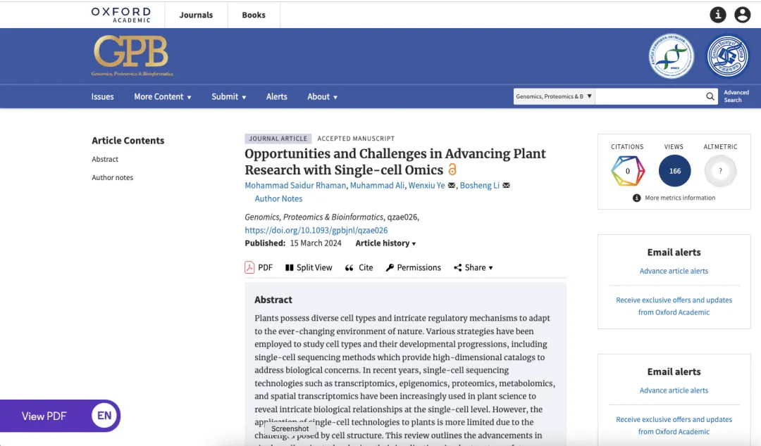 2024年4月,北京大學(xué)現(xiàn)代農(nóng)業(yè)研究院李博生團(tuán)隊(duì)和葉文秀團(tuán)隊(duì)在《Genomics, Proteomics, and Bioinformatics》(IF=9.5)雜志上發(fā)表了一篇綜述文章,題為《Opportunities and challenges in advancing plant research with single-cell omics》。