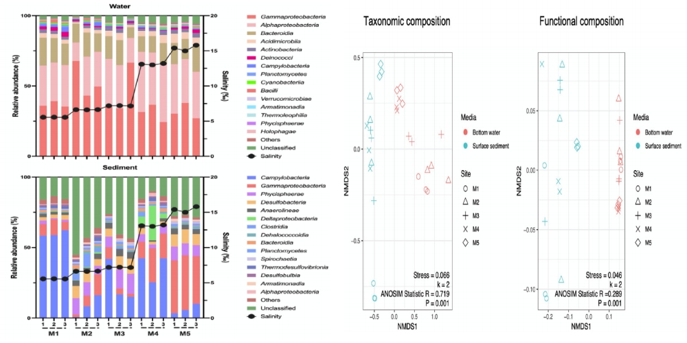 - 由于SWI對沉積細(xì)菌群落有主要影響,對M1(低鹽度)和M5(高鹽度)進(jìn)行了宏基因組測序。通過NMDS分析,沉積物細(xì)菌群落的病灶組成清晰分離;