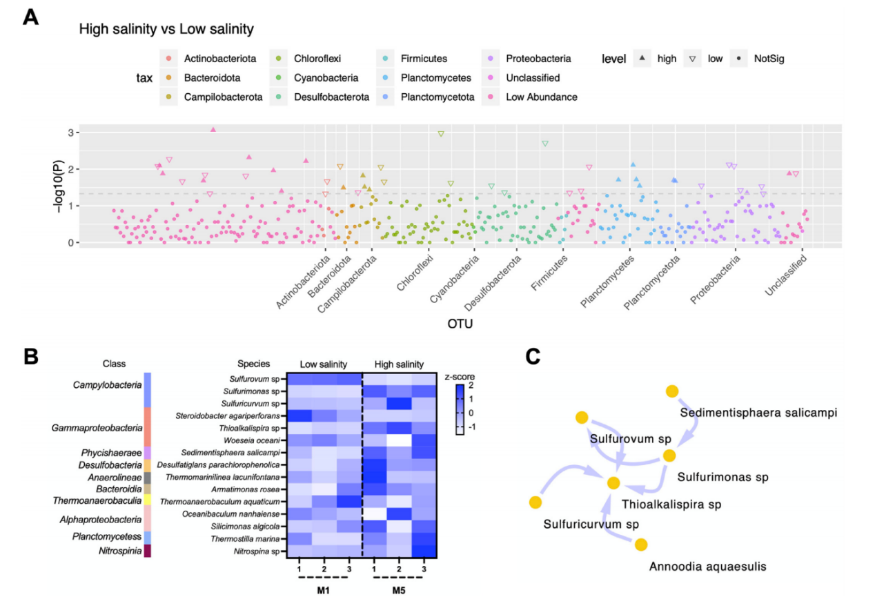 - 沉積性細(xì)菌群落中最豐富的15個細(xì)菌OTUs來自10個類別,其中彎曲桿菌和伽馬變形菌門是最重要的類群,各有3種。與此同時,有11個物種在高鹽度中富集,包括硫脲、硫單胞菌、彎曲桿菌、硫堿桿菌、熱厭氧菌等;