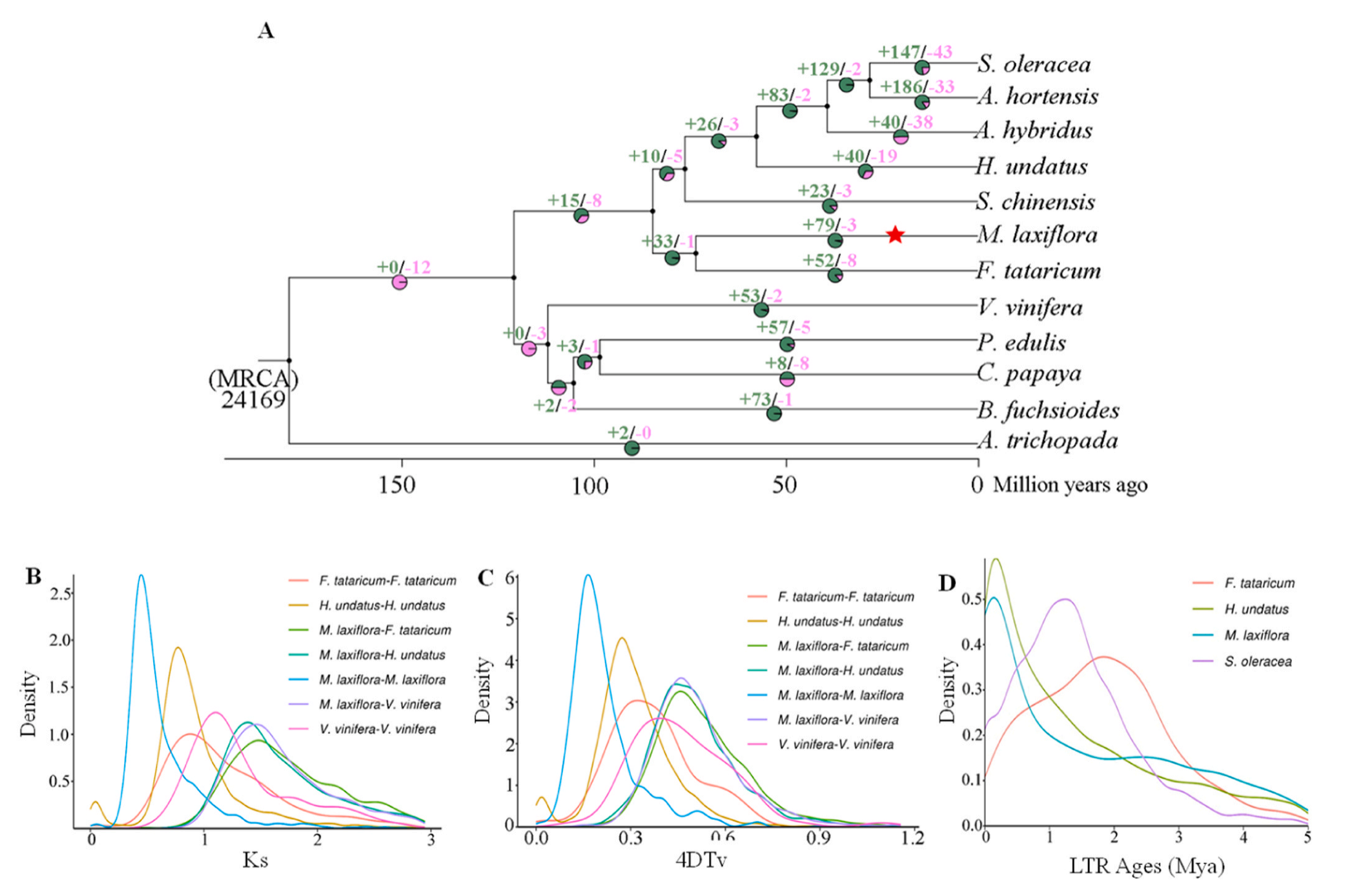 比較基因組研究發(fā)現(xiàn)疏花水柏枝與苦蕎(F. tataricum)的親緣關(guān)系最為密切,大約在65-81百萬年前(Mya)發(fā)生分化;在19.74 ~ 24.60 Mya之間發(fā)生了一次全基因組復(fù)制(WGD), 4dTV分析證實了這一點(diǎn)。在0.15 Mya左右存在一個長末端重復(fù)(LTR)插入。這些基因組變化可能與疏花水柏枝在進(jìn)化過程中所經(jīng)歷的環(huán)境劇變(如青藏高原隆升)有關(guān)?;蚣易宸治鲲@示疏花水柏枝的特有基因家族與能量代謝和信號轉(zhuǎn)導(dǎo)密切相關(guān);85個基因在疏花水柏枝基因組中經(jīng)歷了正選擇,這些基因在與氨基酸合成和代謝相關(guān)的KEGG通路中顯著富集。