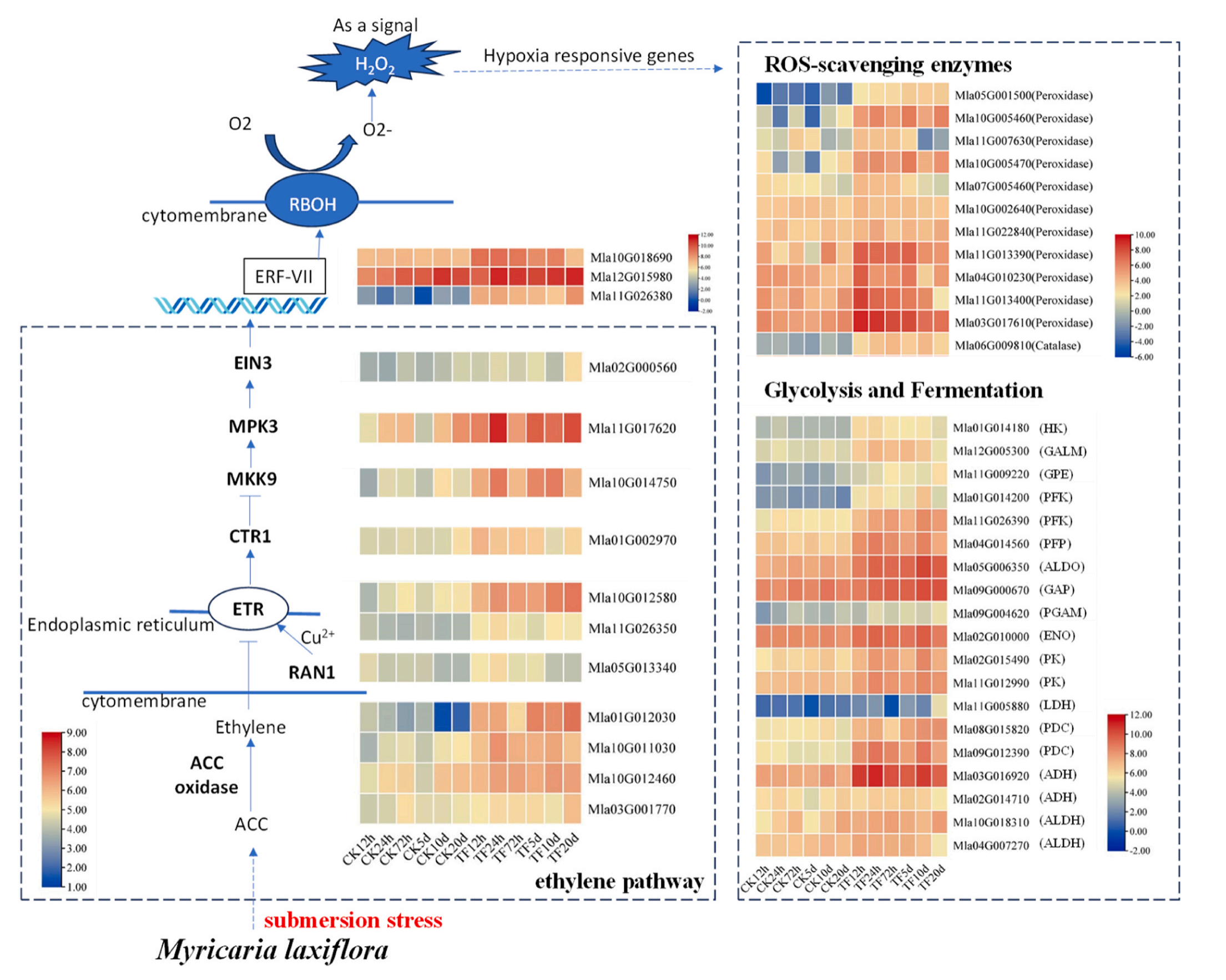 作者通過比較水淹和對照條件下疏花水柏枝形態(tài)、生理和轉(zhuǎn)錄組學(xué)的變化,分析了植物對水淹的適應(yīng)機(jī)制??傮w而言,在完全淹沒的狀態(tài)下,疏花水柏枝采用“靜止”的策略。具體來說,在淹水條件下,光合作用減弱,生長停滯,糖酵解被激活,抗氧化酶系統(tǒng)增強(qiáng)。乙烯反應(yīng)途徑可能是這一過程的調(diào)控因子,MlERF-VII基因(Mla11G026380)可能是調(diào)控這一過程的關(guān)鍵基因。