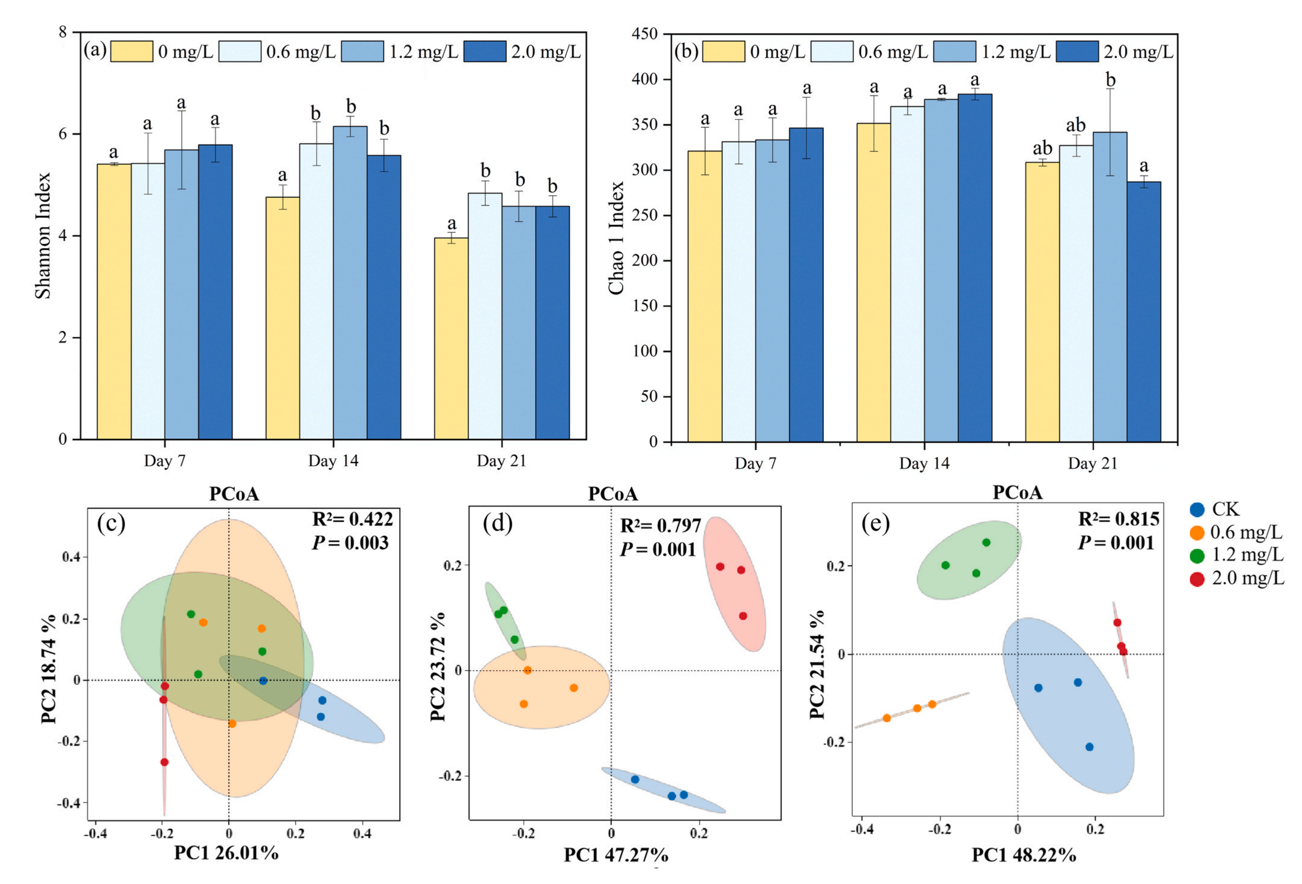 第14天,CK和0.6 mg/L組的Shannon多樣性均高于1.2和2.0 mg/L組(圖2a),處理間Chao1指數(shù)無顯著變化(圖2b, P>0.05);