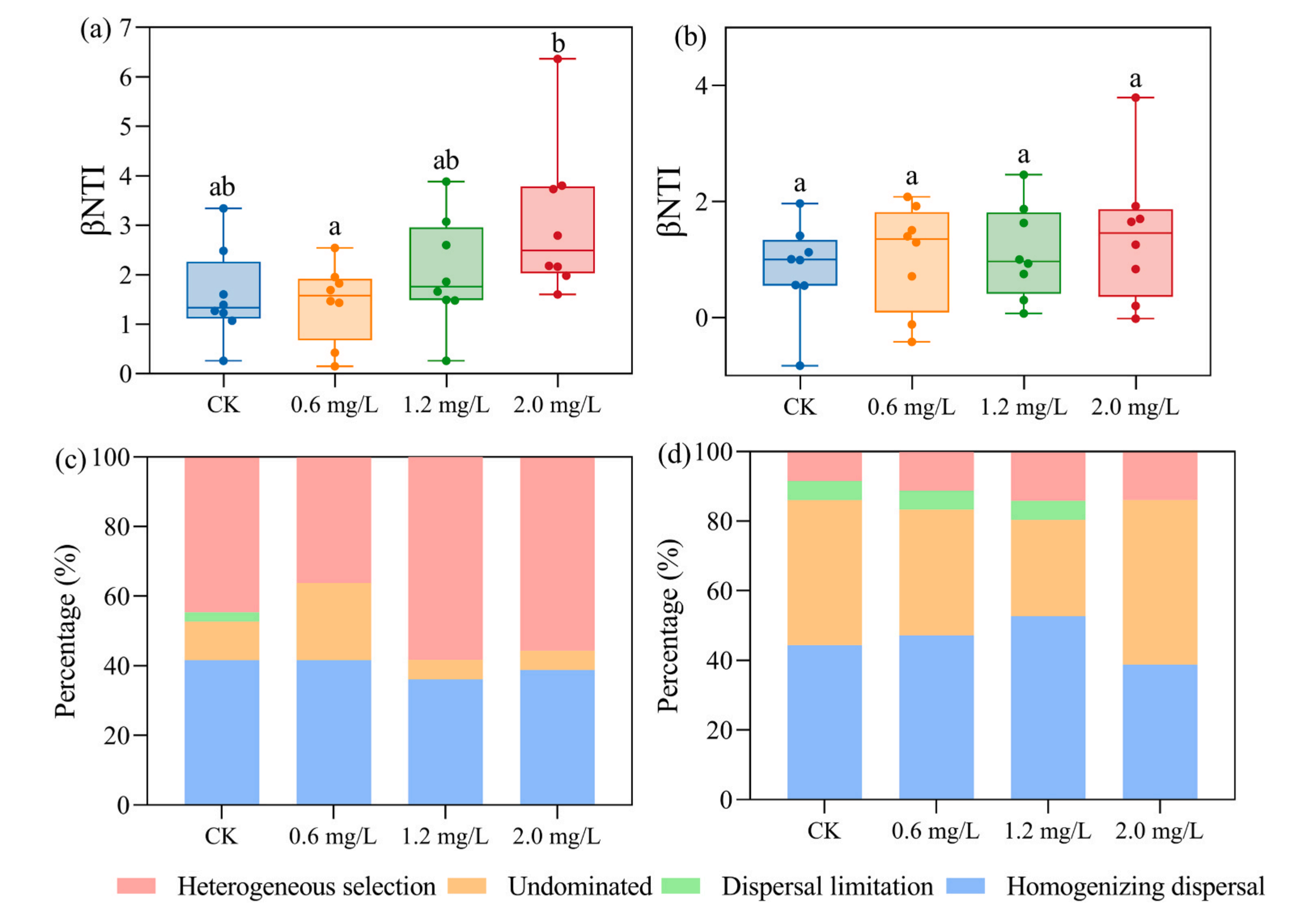 圖6-不同處理組中細菌(a)和微型真核生物(b)的βNTI分布。細菌(c)和微型真核生物(d)群落組裝的周轉(zhuǎn)百分比主要由不同的隨機過程(dispersal limitation and homogenizing dispersal)和確定性過程(homogeneous selection)決定,以及處理中不受任何單一過程(Undominated)控制的百分比。