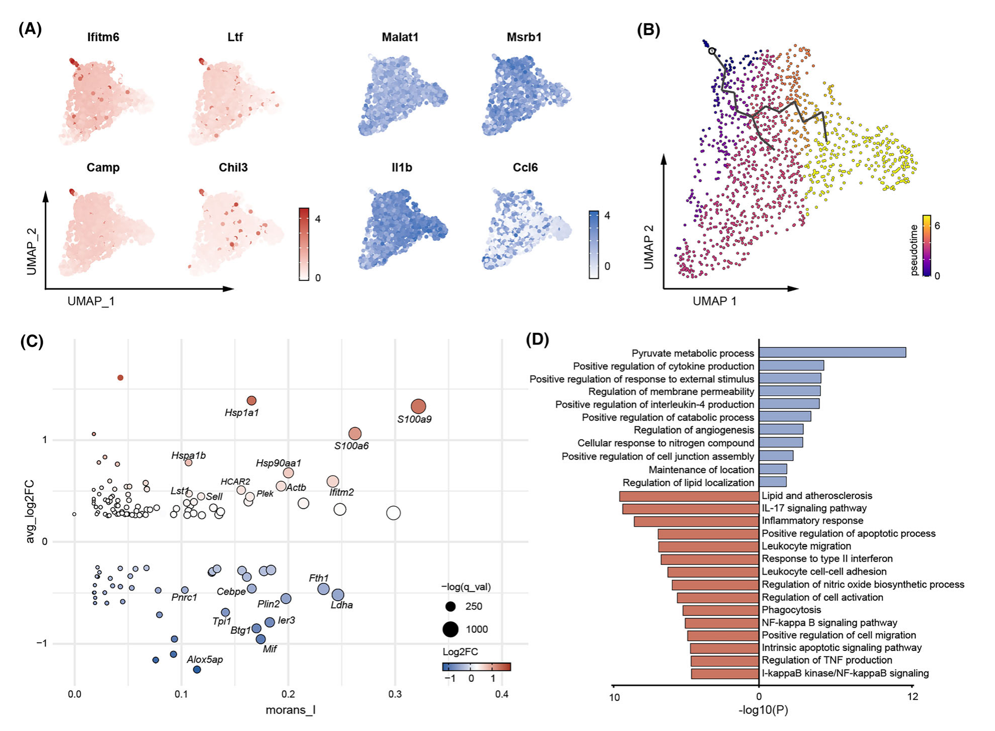 最近的研究根據(jù)中性粒細(xì)胞從骨髓到外周血的遷移決定了中性粒細(xì)胞的轉(zhuǎn)錄組特征,即“中性粒細(xì)胞”。該研究基于scRNA-Seq數(shù)據(jù)集研究了小鼠 IA 模型中性粒細(xì)胞浸潤(rùn)到IA組織時(shí)是否存在這種轉(zhuǎn)錄組特征。結(jié)果顯示假手術(shù)中存在少量中性粒細(xì)胞富集,并形成小鼠模型高表達(dá)的基因標(biāo)記,包括Ifitm6、Ltf、Camp?和?Chil3。這些細(xì)胞表達(dá)較低成熟或老化的基因標(biāo)記,如Malat1、Msrb1、Il1bCcl6(圖?3A),表明它們是從外周血新滲入的。執(zhí)行單片算法來識(shí)別細(xì)胞進(jìn)化軌跡,并將這些新滲透的細(xì)胞指定為起點(diǎn)(圖3B)。根據(jù)莫蘭斯指數(shù) (morans I) 以及未破裂(假手術(shù))和破裂小鼠模型中的基因表達(dá),該研究計(jì)算了 IA 組織中新浸潤(rùn)和老化中性粒細(xì)胞的基因特征(圖3C)。與之前的研究一致,新浸潤(rùn)的中性粒細(xì)胞高表達(dá)Cebpe,在粒細(xì)胞生成和炎癥因子產(chǎn)生中發(fā)揮作用,而相對(duì)老化的中性粒細(xì)胞表達(dá)S100a 家族基因和伴侶,如?Hspa1b、Has1a1??Hsp90aa1,表明壓力或衰老狀態(tài)。富集分析揭示了這些細(xì)胞的不同功能,新浸潤(rùn)的中性粒細(xì)胞中富集了多種代謝途徑,而老化的中性粒細(xì)胞則激活了炎癥和凋亡相關(guān)途徑(圖3D)??傊?,這些結(jié)果表明 IA 組織中存在中性粒細(xì)胞,并強(qiáng)調(diào)了它們的功能異質(zhì)性。