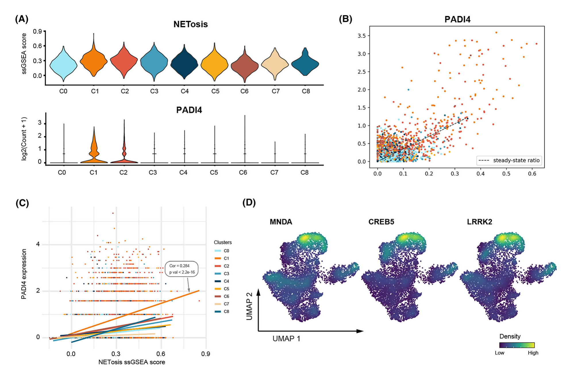 NET 的產(chǎn)生是中性粒細(xì)胞導(dǎo)致 IA 破裂的另一種方式,且取決于稱為 NETosis 的過程。因此,抑制 NETosis 是 IA 有前景的治療靶點(diǎn)。然而,由于這些細(xì)胞的多功能性,發(fā)生 NETosis 的中性粒細(xì)胞亞群尚不清楚。作者的結(jié)果表明 NETs 形成信號(hào)通路在 C1 中富集(圖2B)。該研究從京都基因和基因組百科全書 (KEGG) 數(shù)據(jù)庫(kù)中收集了人類 NETosis 基因特征,發(fā)現(xiàn) NETosis 的 ssGSEA 評(píng)分在 C1 中升高(圖7A)。PADI4?的表達(dá)對(duì)于組蛋白瓜氨酸化至關(guān)重要,在 C1 中上調(diào),并表現(xiàn)出正相關(guān)的未剪接/剪接 mRNA 比率(圖 7B),表明PADI4在驅(qū)動(dòng)C1 NETosis中發(fā)揮作用。此外,PADI4的表達(dá)與C1中NETosis的ssGSEA評(píng)分成正比(圖7C),證實(shí)C1易于發(fā)生NETosis。與其他中性粒細(xì)胞相比該中性粒細(xì)胞子集專門表達(dá)?MNDA?(Pct.1?=?91.8%, Pct.2?=?54.5%),?CREB5?(Pct.1?=?74.7%, Pct.2?= 33.7%) 和?LRKK2?(Pct.1?=?78.4%, Pct.2?=?36.2%) ?(圖7D),因此可以作為抑制 NETs 介導(dǎo)的 IA 進(jìn)展的目標(biāo)。