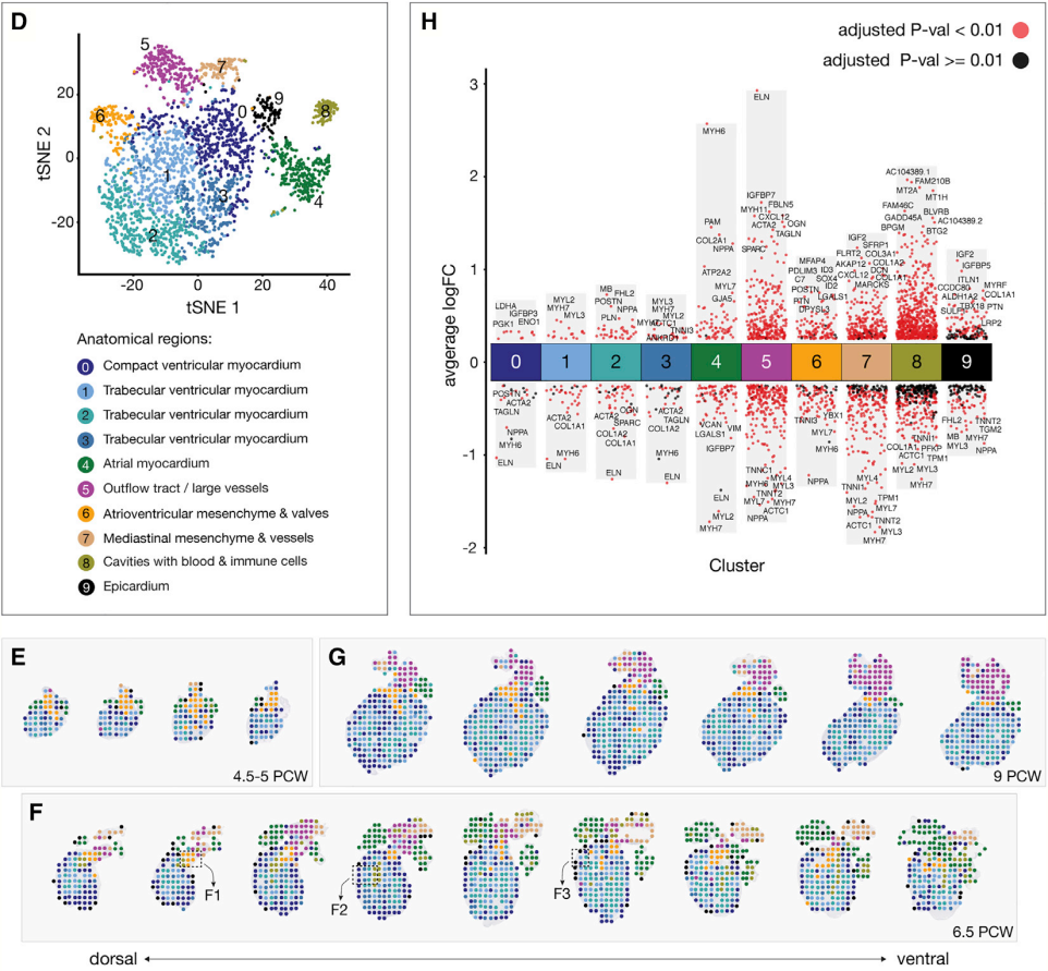取樣策略:4.5-5 PCW 4張切片,6.5 PCW 9張切片,9 PCW 6張切片,合計(jì)19張切片文章構(gòu)建了單細(xì)胞時(shí)空水平的發(fā)育中器官的3D轉(zhuǎn)錄圖譜,這種多轉(zhuǎn)錄組測(cè)序方法可以應(yīng)用于其他器官發(fā)育的研究中。這一突破性研究使探索組織的整體空間轉(zhuǎn)錄模式成為可能,探索細(xì)胞異質(zhì)性,并選擇性地靶向一些表達(dá)模式具有空間異質(zhì)性且造成細(xì)胞類型差異的關(guān)鍵基因。心臟發(fā)育模型表明,空間、時(shí)間信息與單細(xì)胞基因表達(dá)數(shù)據(jù)的整合對(duì)于識(shí)別細(xì)胞類型之間的關(guān)鍵差異、深入分析發(fā)育中的組織是至關(guān)重要的。
