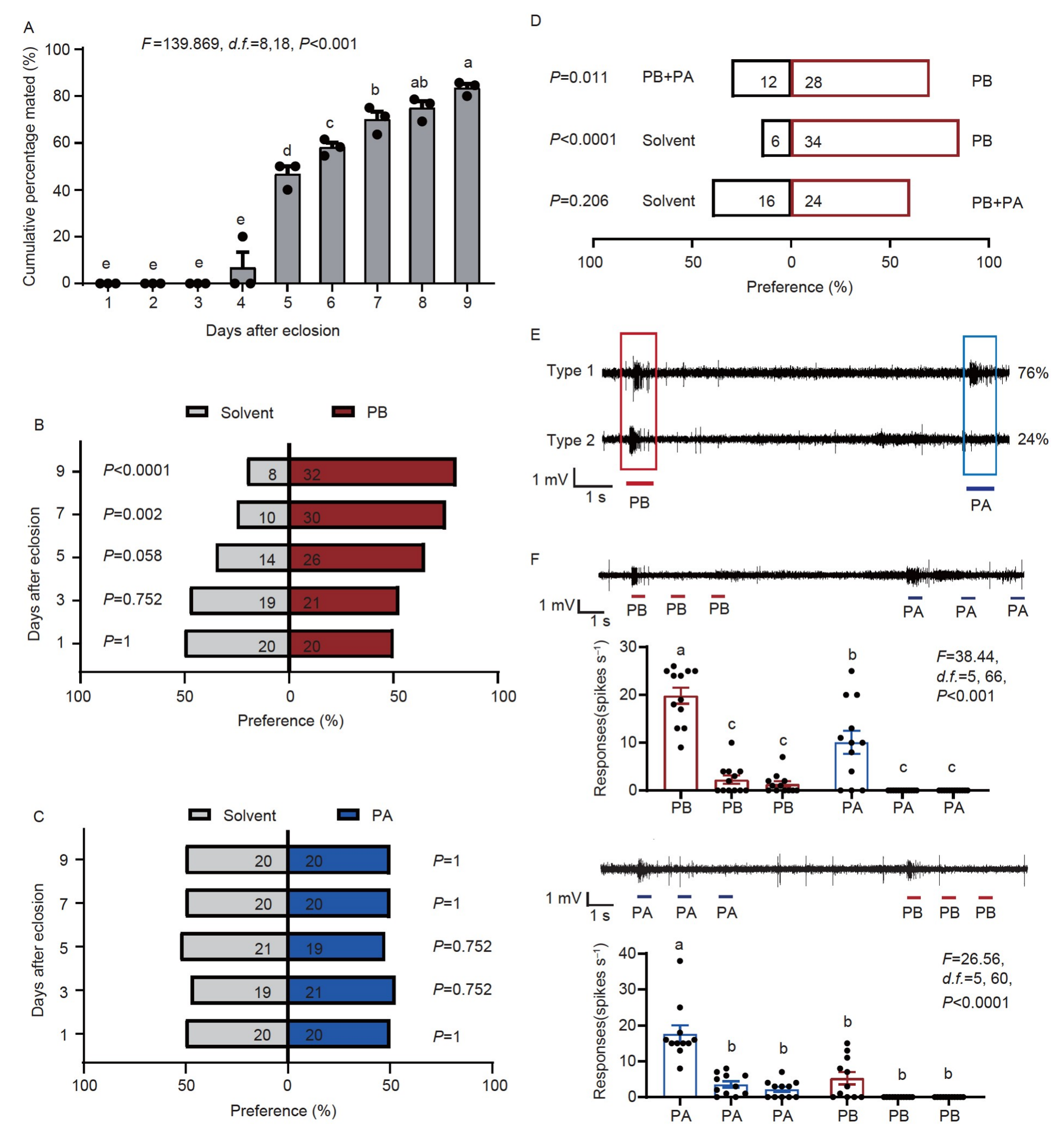 研究團(tuán)隊(duì)使用Y型管嗅覺儀對不同日齡的雄蟲進(jìn)行了行為學(xué)測試,以觀察它們對PB和PA的反應(yīng)。此外,通過視頻記錄和分析,評估了雄蟲的交配行為。交配率在5 DAE時增加到近50%,6 DAE時增加到60%以上,此后緩慢而穩(wěn)定地積累(圖1A)。雄蟲對PB和PA的偏好測試結(jié)果反應(yīng),PB是主要的性信息素成分,能夠顯著吸引雄蟲。而PA雖然單獨(dú)存在時不吸引雄蟲,但其存在能夠減弱PB的吸引作用(圖1B-D),表明PA可能在調(diào)節(jié)性行為中起到平衡作用。