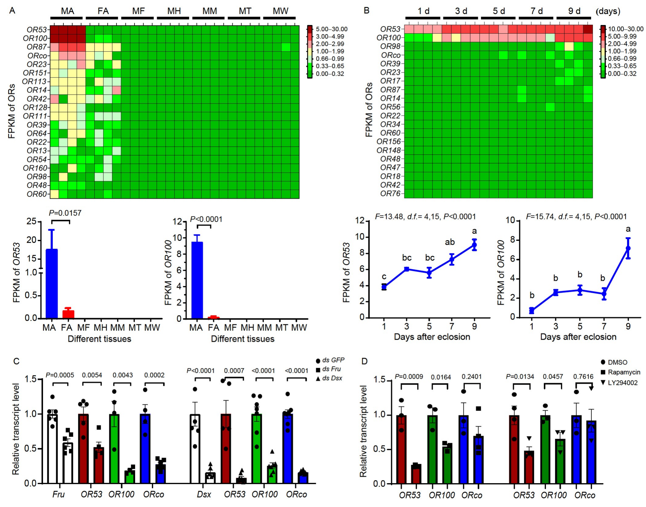 研究人員利用Bulk RNA測序技術(shù)分析了雄蟲不同組織中嗅覺受體基因的表達(dá)情況,并通過果蠅遺傳學(xué)方法,將美洲大蠊的嗅覺受體基因在果蠅中表達(dá),以鑒定PA和PB的受體。通過RNA測序分析得到的嗅覺受體基因在不同組織(雄蟲觸角-MA、雌蟲觸角-FA、雄蟲前足-MF、雄蟲頭部-MH、雄蟲口器-MM、雄蟲精巢-MT和雄蟲翅-MW)和不同日齡中的表達(dá)水平(圖2A、2B),以及通過qPCR驗(yàn)證的OR53、OR100和ORco基因在雄蟲觸角中敲除fru或dsx基因后的表達(dá)水平(圖2C),以及經(jīng)過營養(yǎng)信號通路抑制劑處理后的表達(dá)水平變化(圖2D)。研究鑒定出OR53和OR100為PA/PB和PA的受體,并發(fā)現(xiàn)它們在雄蟲觸角中的表達(dá)模式與行為測定結(jié)果相吻合,證實(shí)了這兩種受體在性信息素感知中的關(guān)鍵作用。